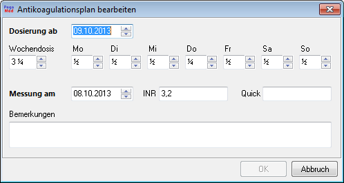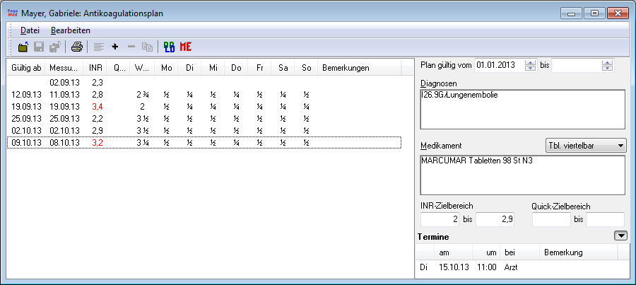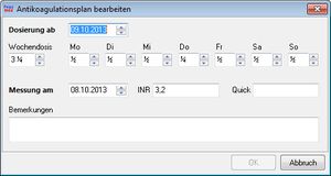 Antikoagulationsplan Der Antikoagulationsplan hilft Ihnen komfortabel bei der elektronischen Behandlungsdokumentation von Patienten, die eine dauerhafte Verordnung von Blutverdünnern (Marcumar, Falithrom etc.) erhalten.